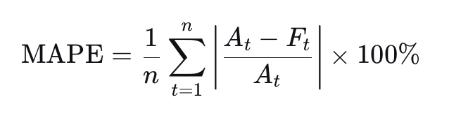 - MAPE сильнее наказывает за ошибки, когда фактические значения низкие. Например, если Bitcoin стоит $60 000 (A), а прогноз был $30 000 (F), ошибка составит 50%. Но если Bitcoin стоит $30 000 (A), а прогноз был $60 000 (F), ошибка будет уже 100%, хотя абсолютная разница в долларах одна и та же ($30k).