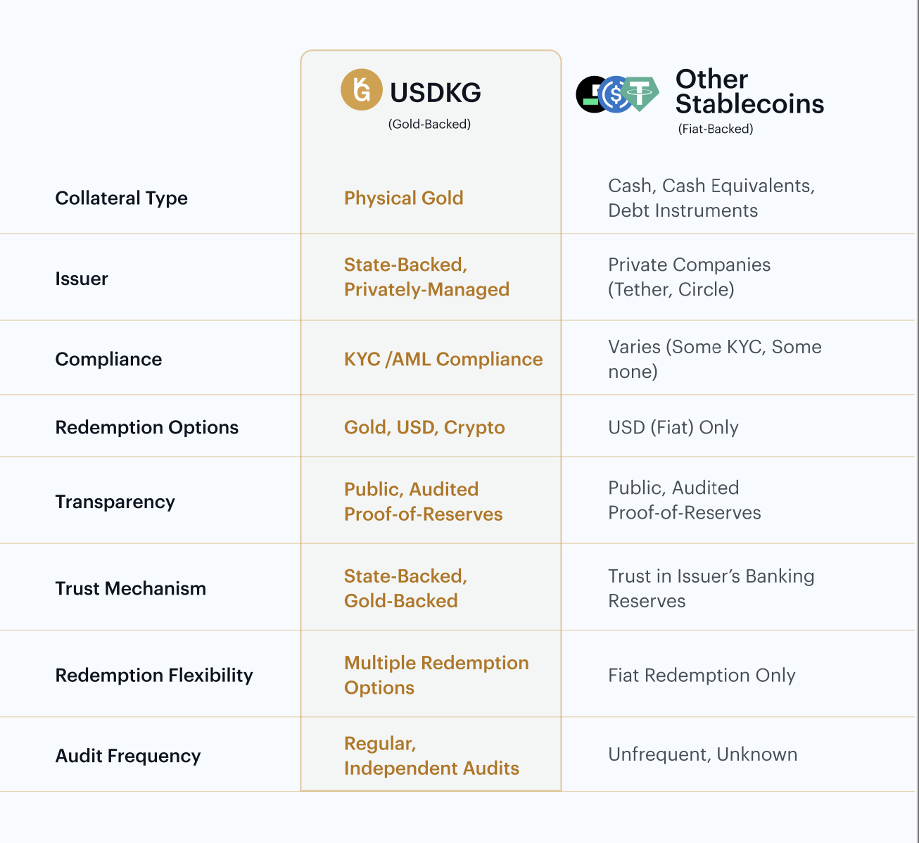 Каждый выпущенный токен USDKG подкреплён физическим золотом из госрезервов. Это создаёт двойную гарантию стабильности: